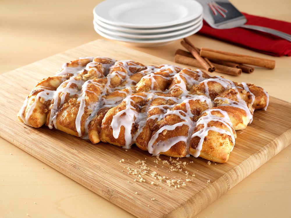 Oven-baked artisan pull-apart bread topped with sweetened cinnamon spread streusel topping drizzled with vanilla icing. Serves 4.