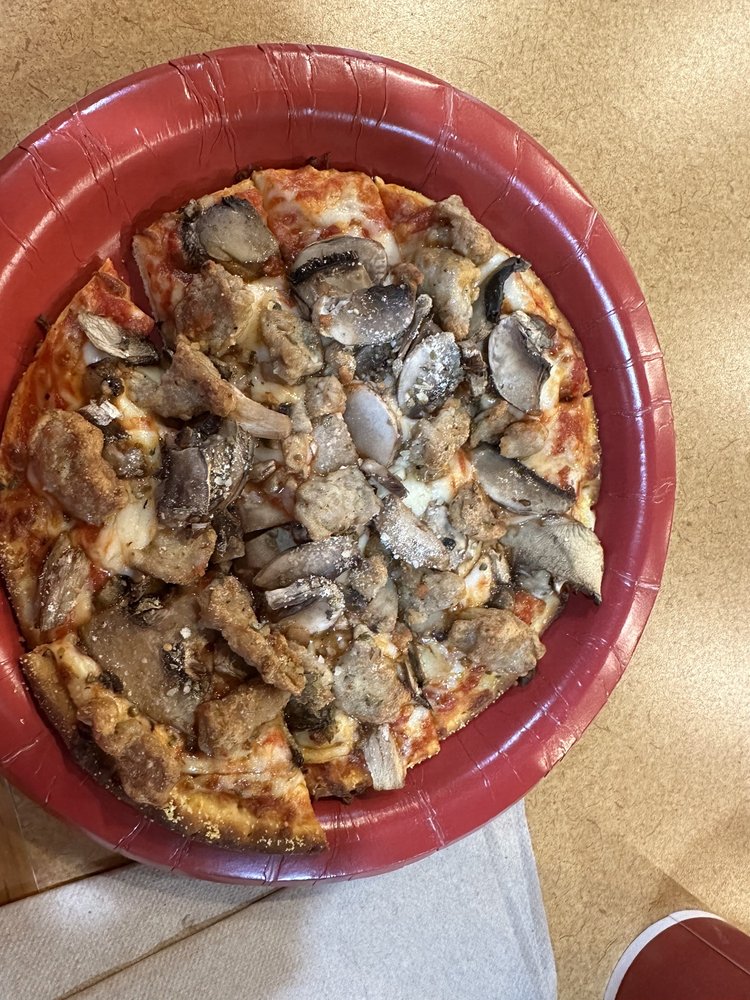 Family recipe pepperoni and sausage, fresh mushrooms, smoked Provolone, Romano.