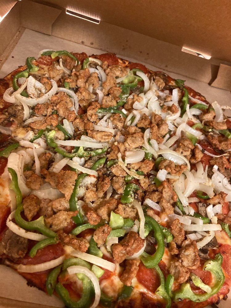 Family recipe pepperoni and sausage, freshly cut green peppers and yellow onions, fresh mushrooms, smoked Provolone, Romano.